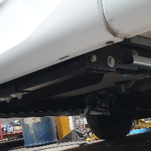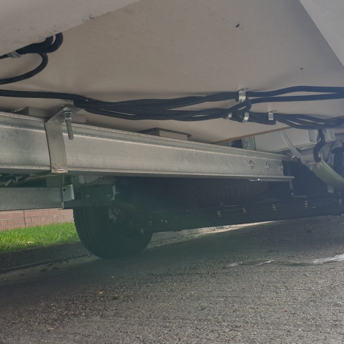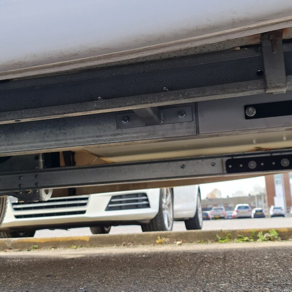 If we have nothing to work with and there is no way of strengthening what is already fitted, then we have complete chassis extension kits like the 3 photos below showing our complete Fiat Ducato extensions. The 1st photo is a heavy duty 6mm thick extension kit running alongside the original weak extensions then instead of fitting triangulation brackets we have tied both extensions together which achieves the same result. Photo 2 is the same process but using the lighter weight lipped extensions as the overhang wasn’t as great and photo 3 is the heavy-duty extensions simply fitted with triangulation reinforcements as there was nothing else under the motorhome just a blank space.