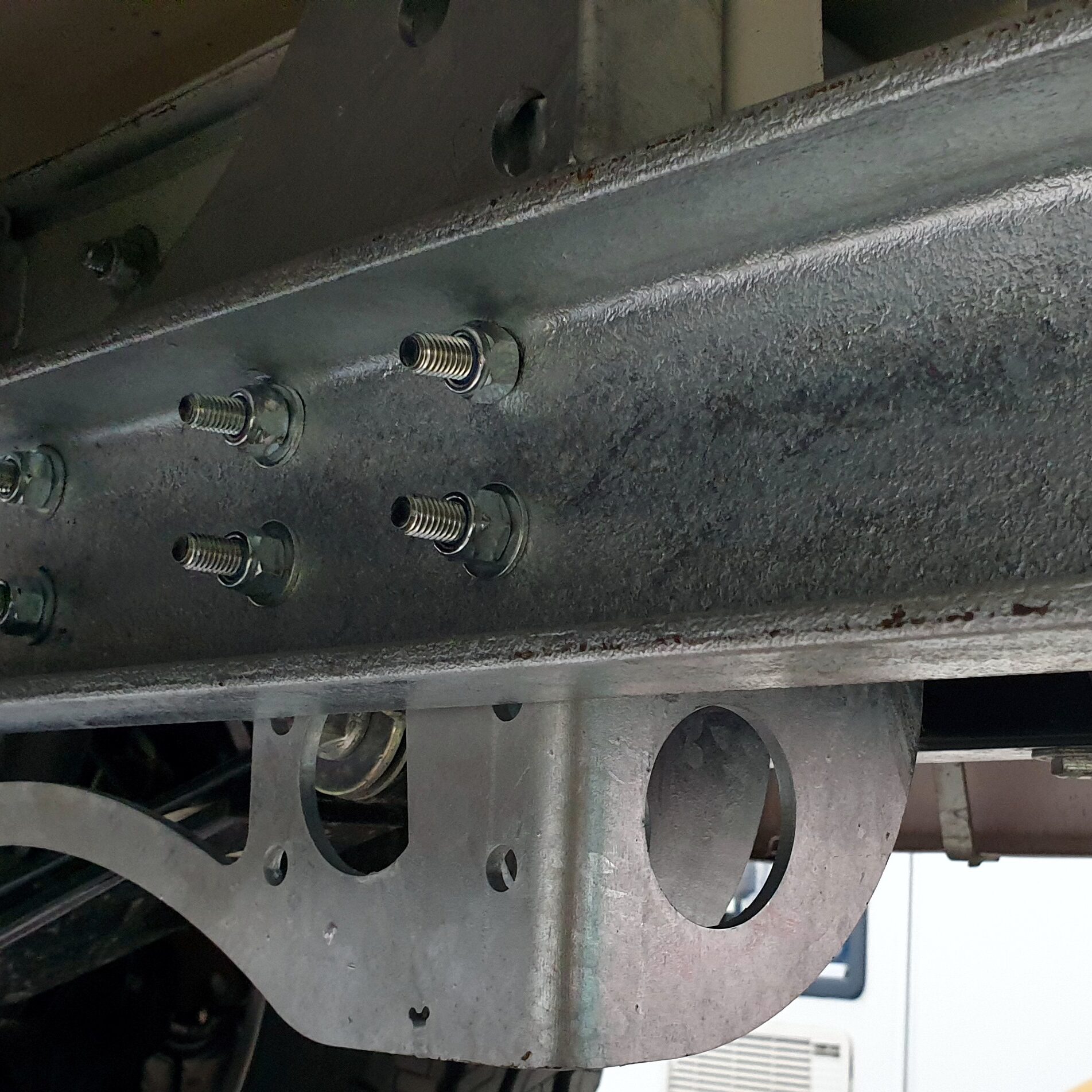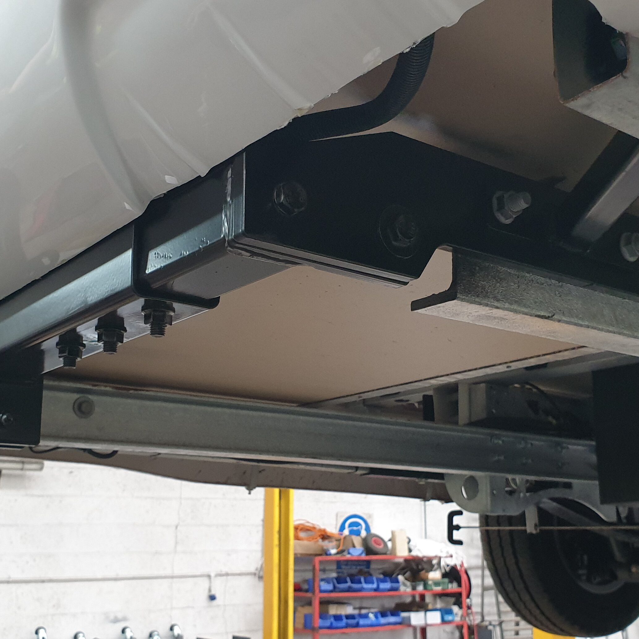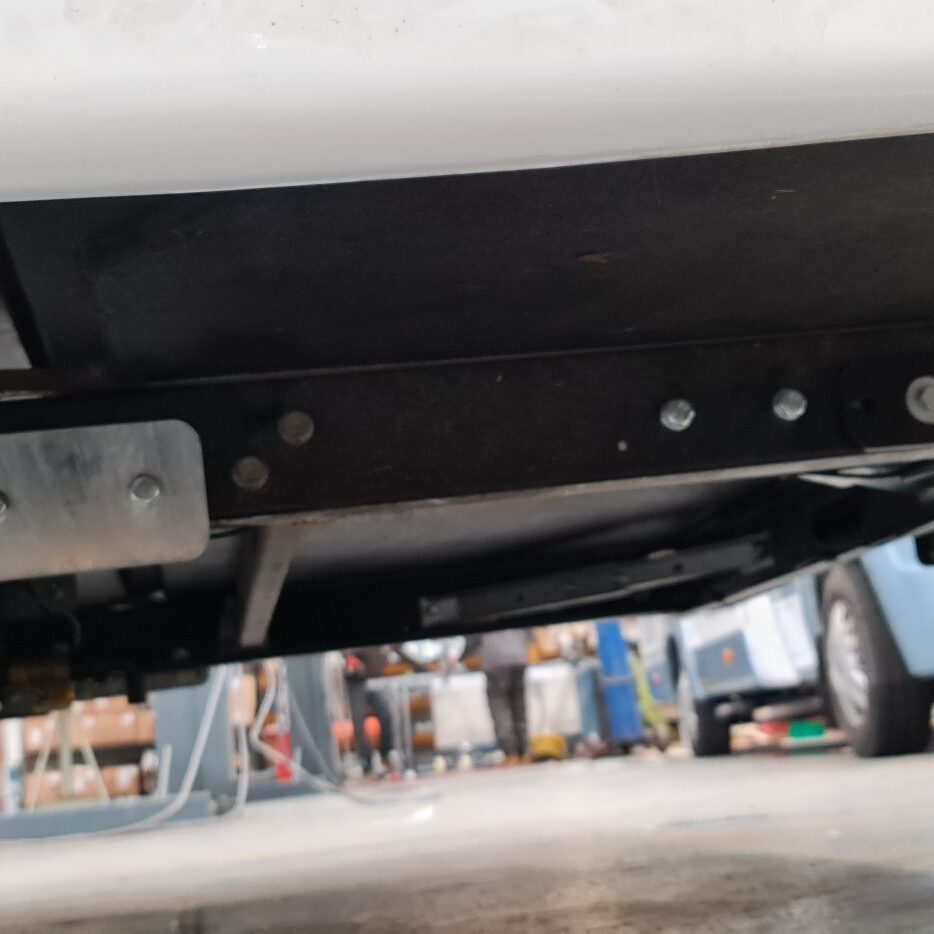 extensions that look suitable to tow from we then need to see how well these are connected to the main base vehicle chassis i.e. a Fiat as they are often secured with a small cluster of 3 – 4 bolts on the very end of the Fiat chassis but the extensions can be anything from 800mm – 1.7m long, so hanging a towbar on these will simply break the extension at the end of the Fiat chassis, so we need to reinforce this connection. With the Fiat range we have some special 8mm thick laser cut galvanized S plates to do this as you can see in the photo on the left. This significantly reinforces the connection by going down the chassis and connecting into the holes already in the Fiat chassis further down near where the shock absorbers mount to the chassis creating a large lever effect type strengthening. If the channels are only 2mm thick or 3mm thick but very long, then we would also fit back to back chassis extensions to reinforce the existing ones making them 5-6mm thick and substantially strengthening them. You can see the original 2mm thick extensions in the photo to the right but if you look at the furthest away extension you will see the galvanized lipped channels we have added. As mentioned earlier if the extensions are 1200mm or over then they will also require the triangulation reinforcements which you can just make out in the photo that was fitted.