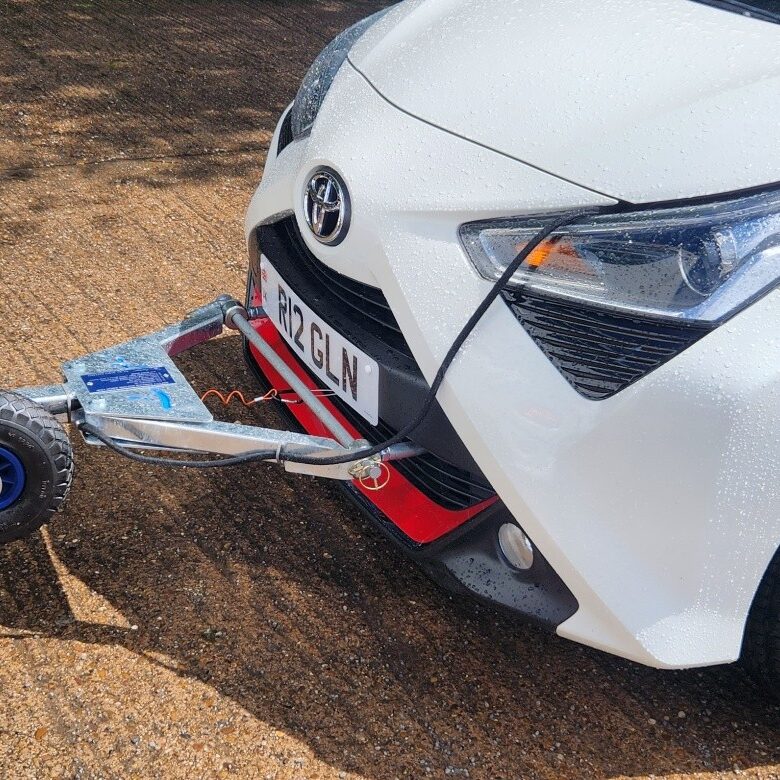 The system is very user friendly just connect the A frame to the towing eyes which are removable just like our Over-run braked A frames are, plug in the electrics, remove the steering lock,