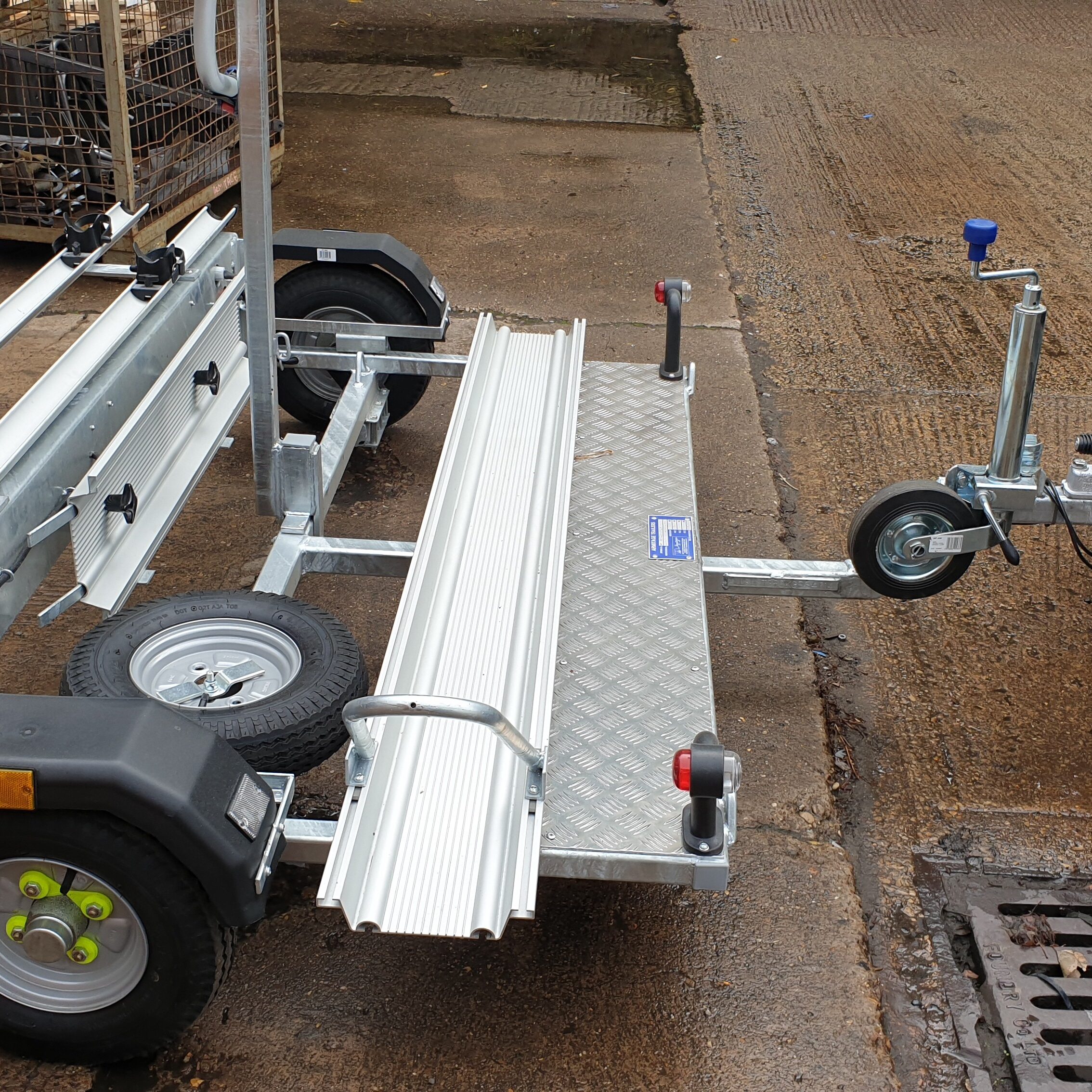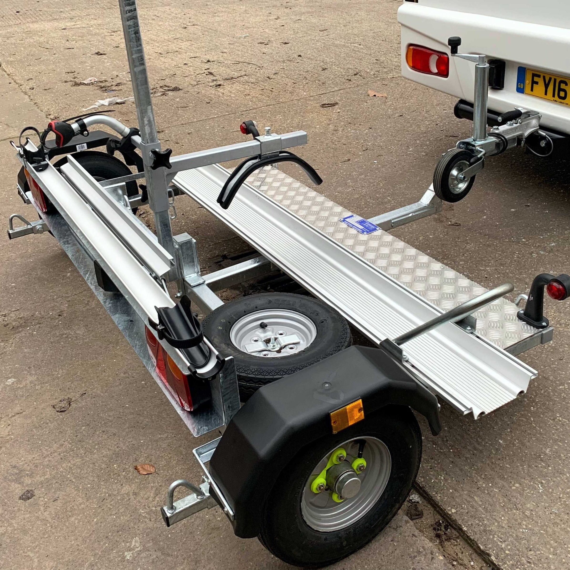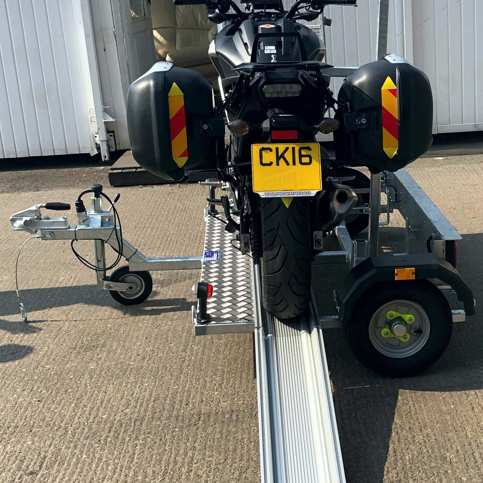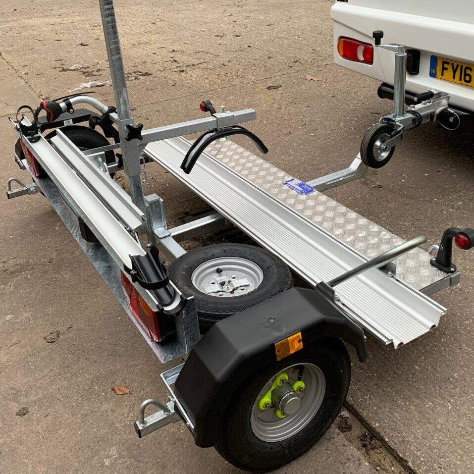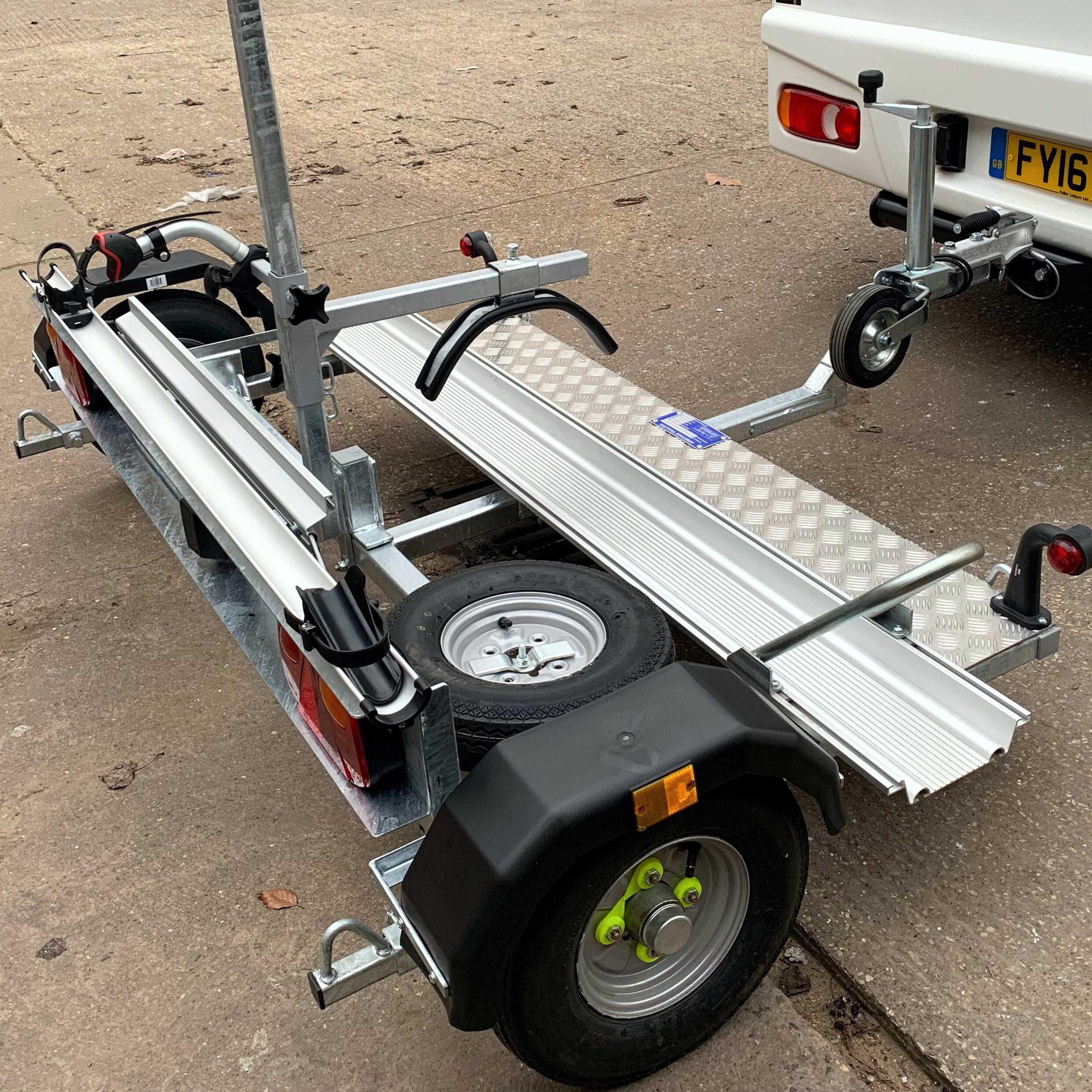 Developed from our tried and tested Standard Transverse trailer but for those that have heavy bikes and are not very confident in taking such a bike 20″ in to the air whilst still standing on the ground all though the incline is very steady with the extra long folding aluminium ramp but this is only 9″ off the ground not much higher than a tall kerb.