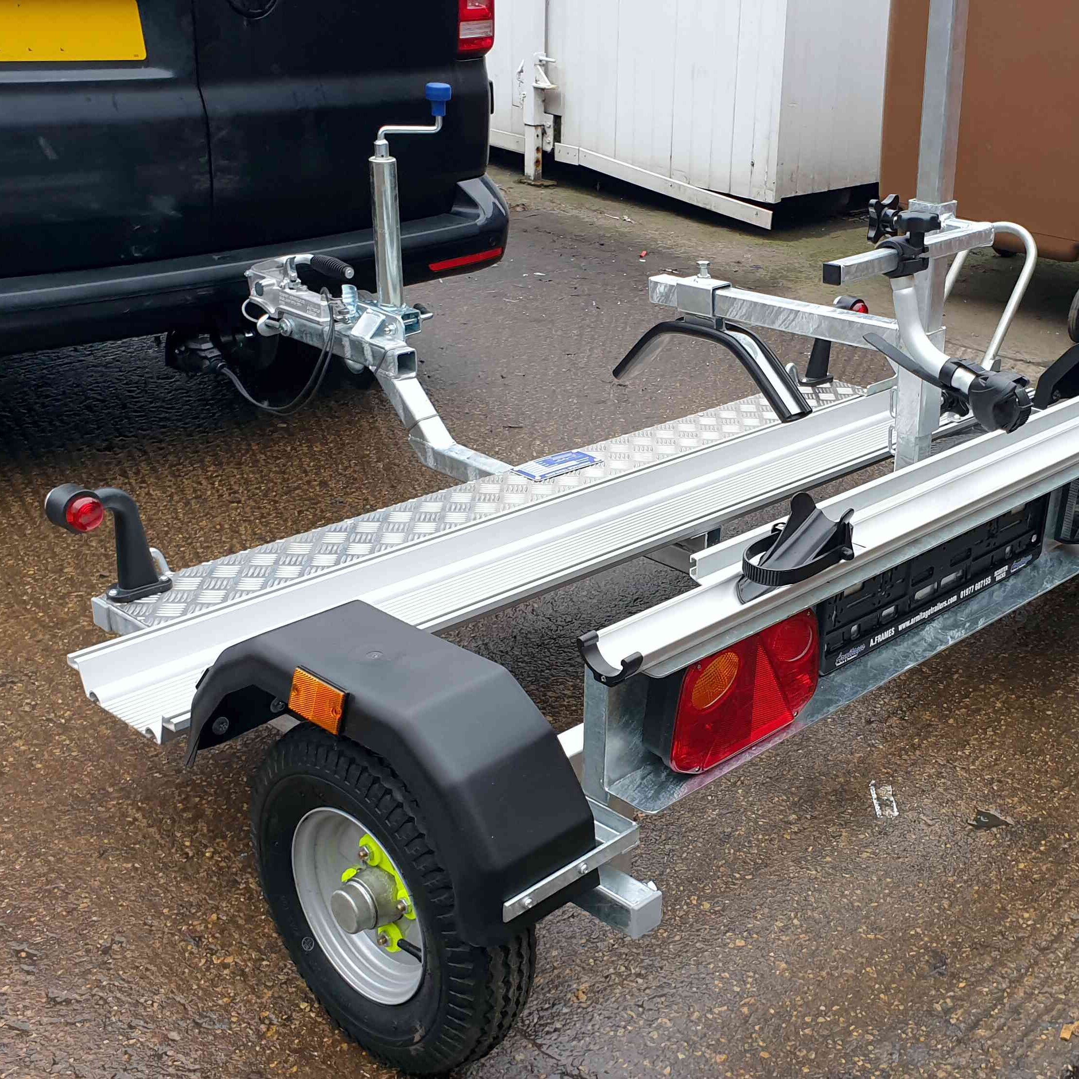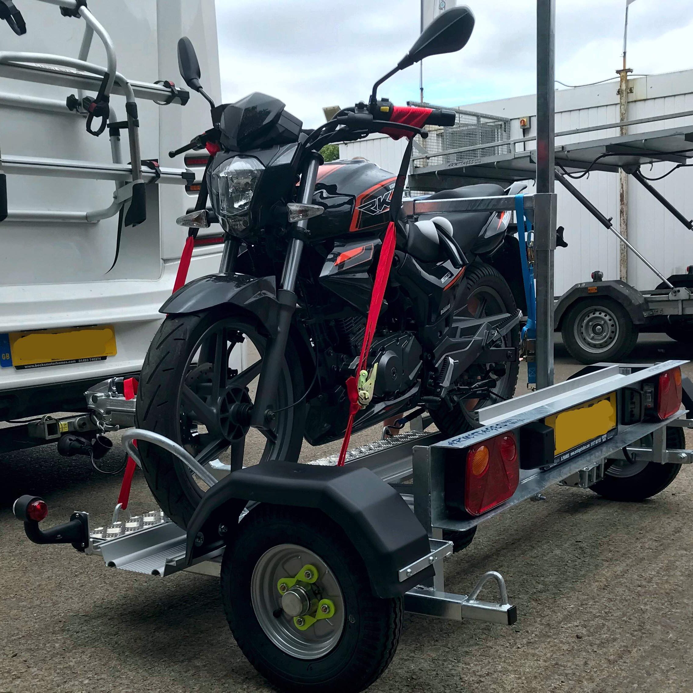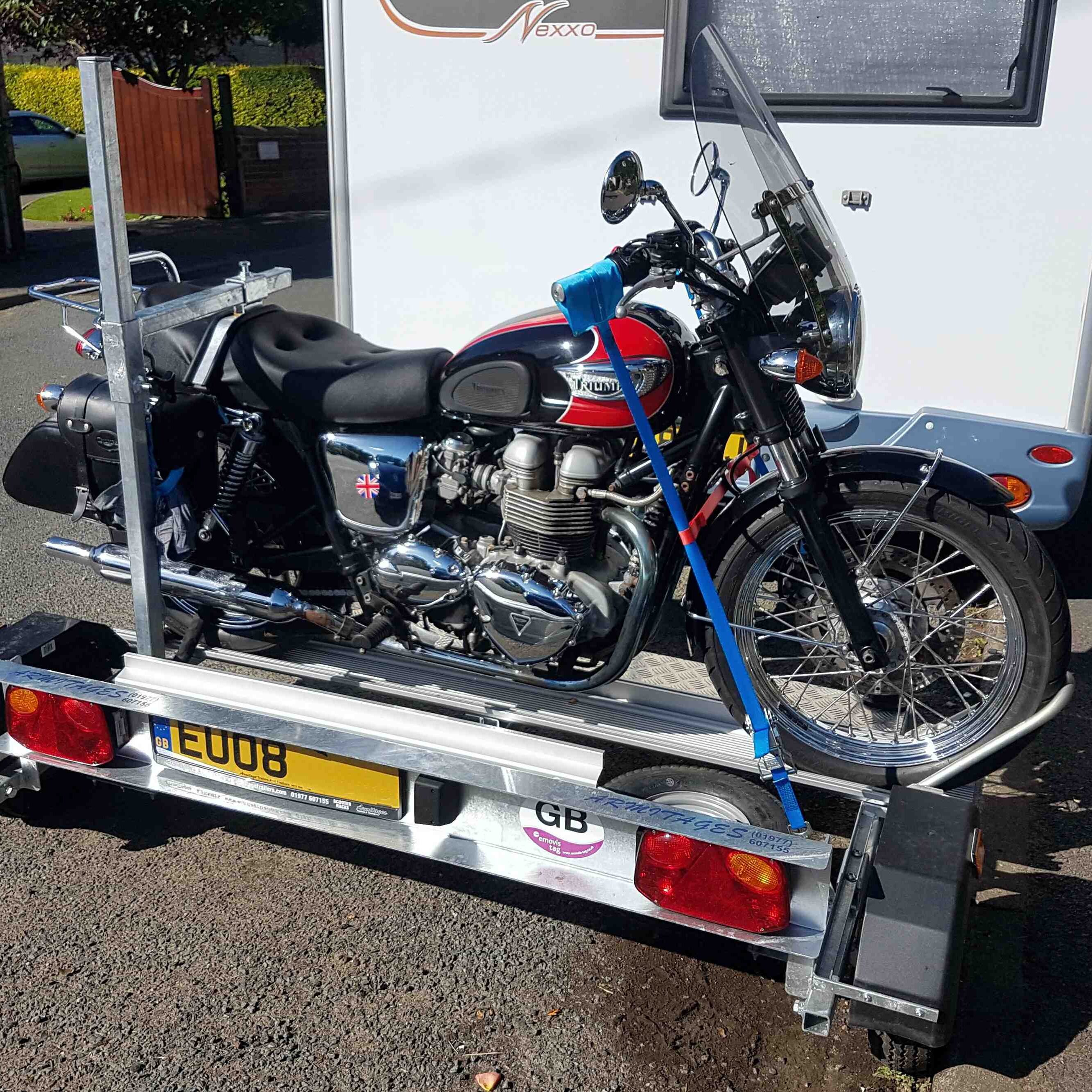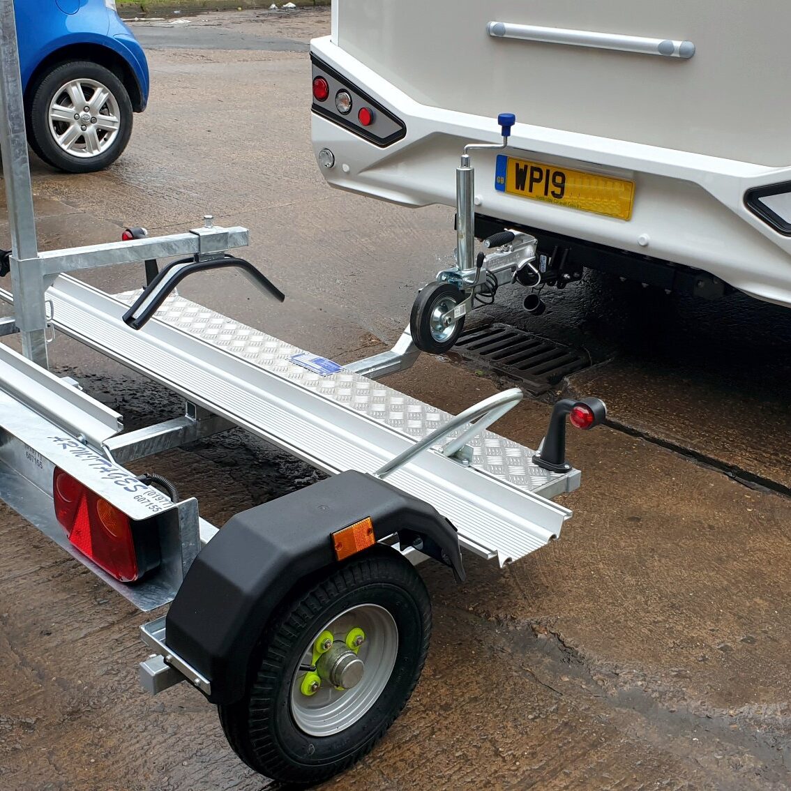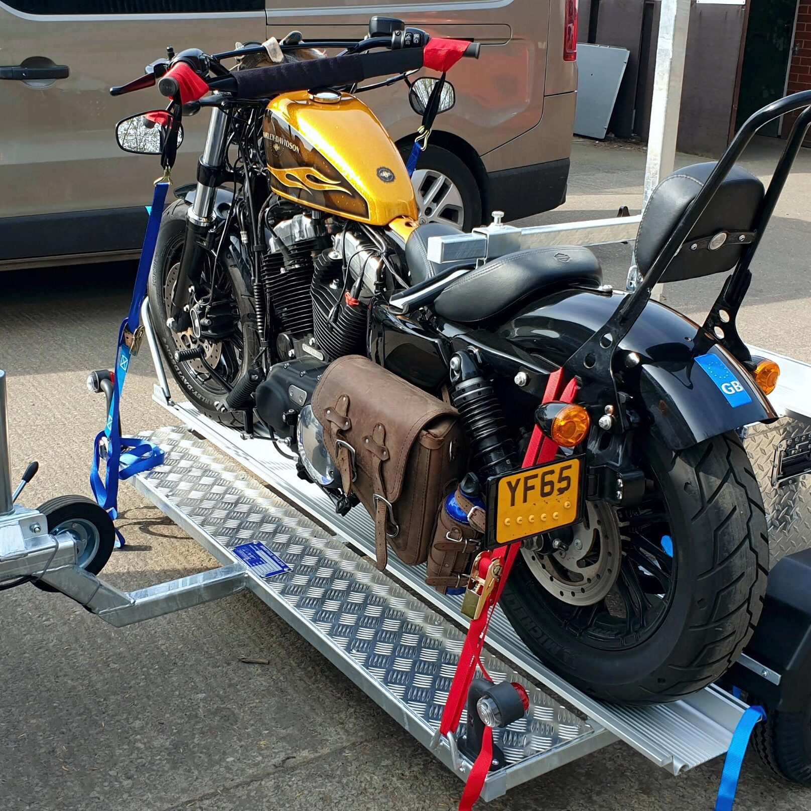 Developed from our tried and tested Standard Transverse trailer but for those that have heavy bikes and are not very confident in taking such a bike 20″ in to the air whilst still standing on the ground all though the incline is very steady with the extra long folding aluminium ramp but this is only 9″ off the ground not much higher than a tall kerb.