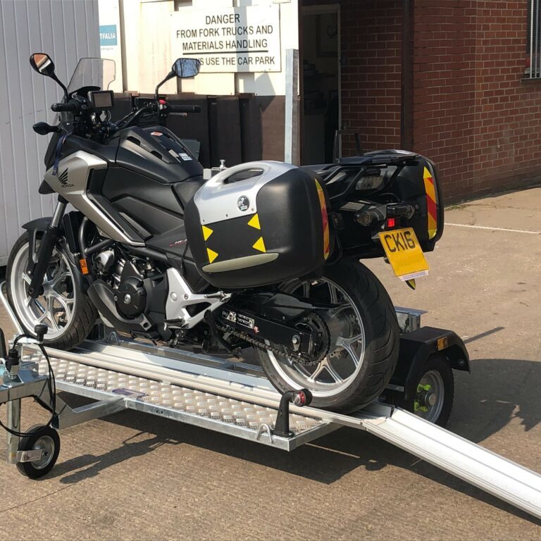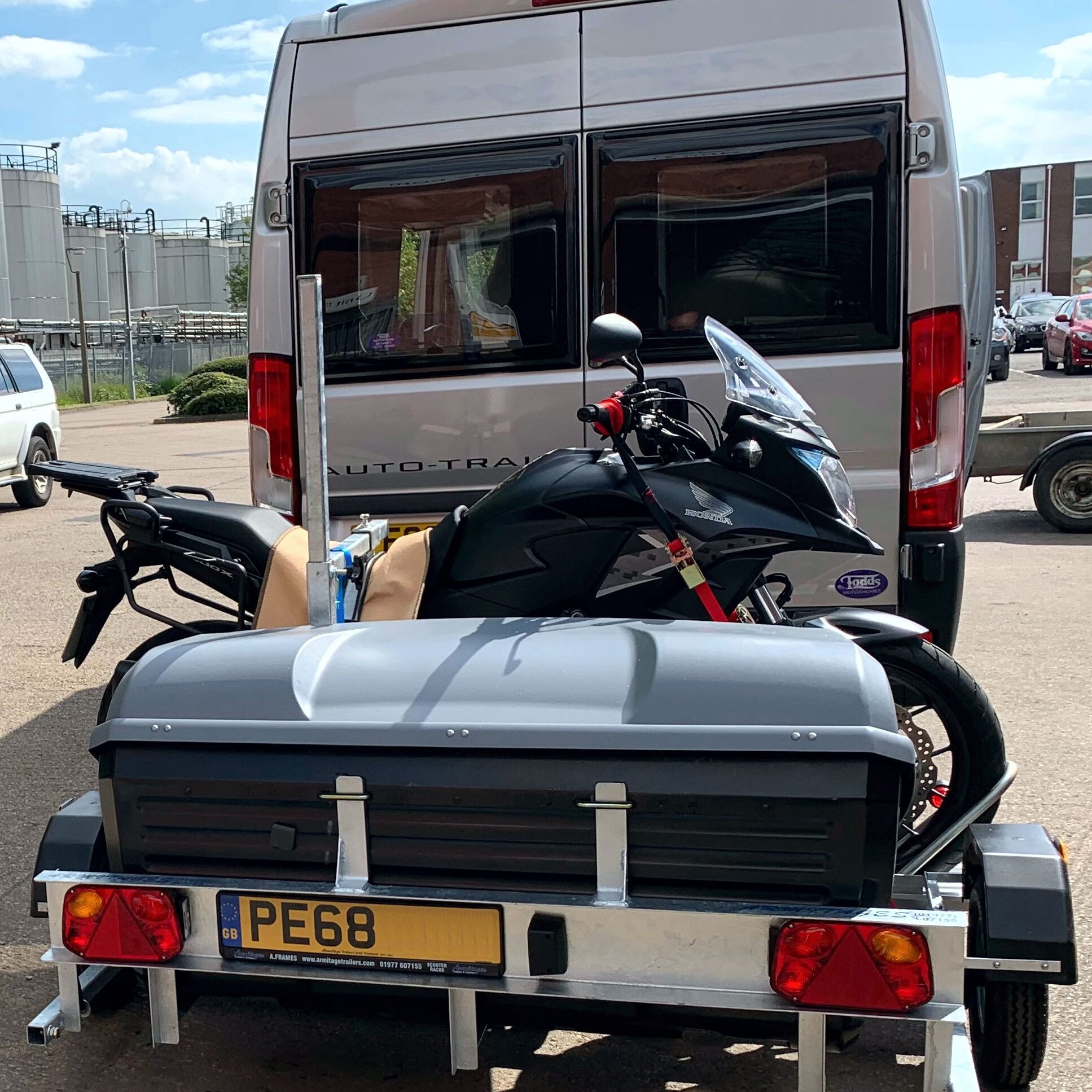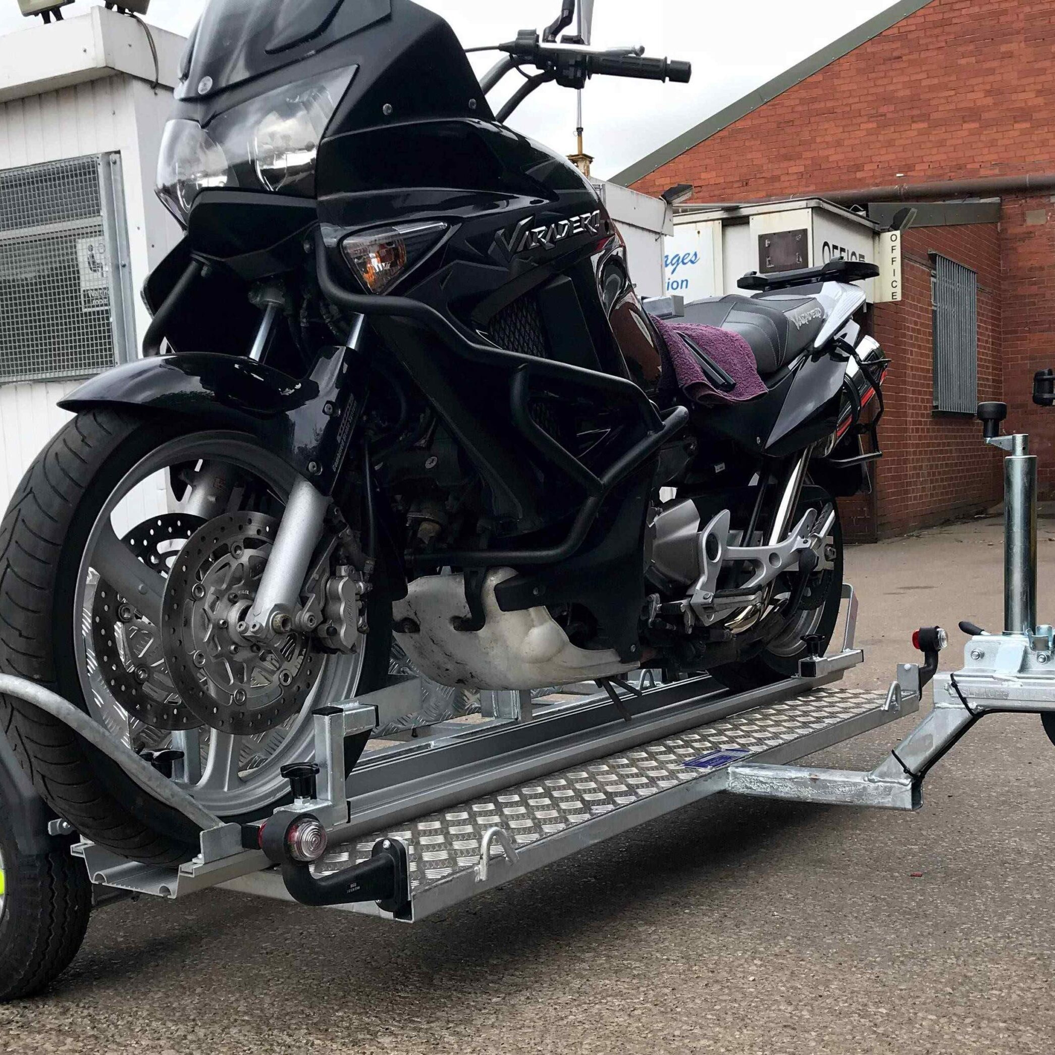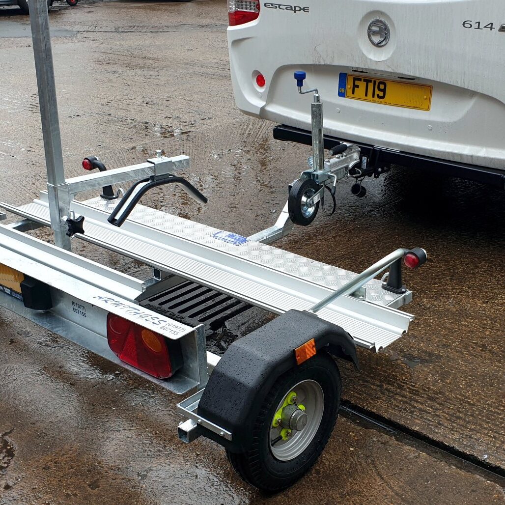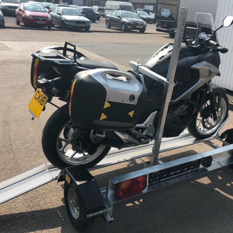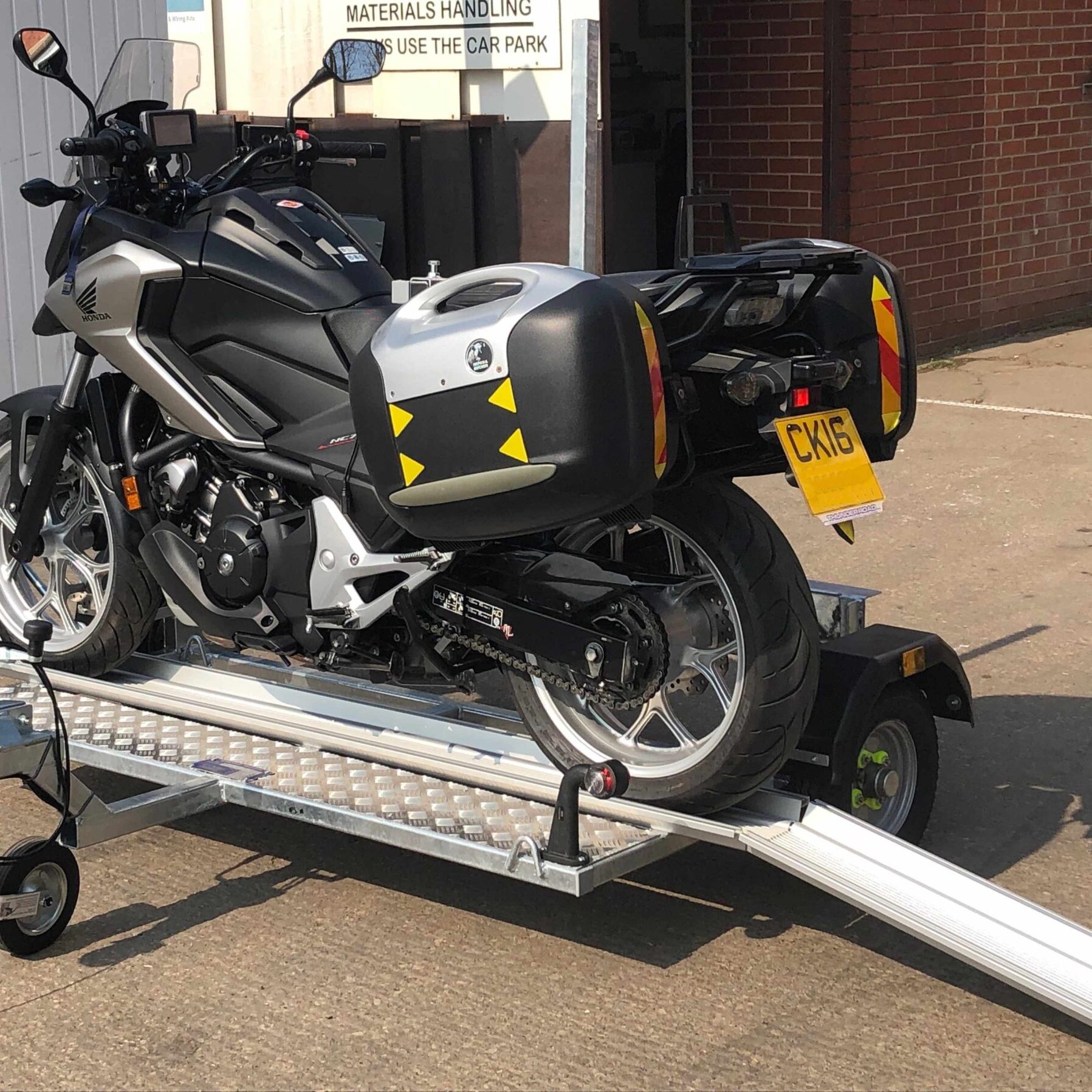 Developed from our tried and tested Standard Transverse trailer but for those that have heavy bikes and are not very confident in taking such a bike 20″ in to the air whilst still standing on the ground all though the incline is very steady with the extra long folding aluminium ramp but this is only 9″ off the ground not much higher than a tall kerb.