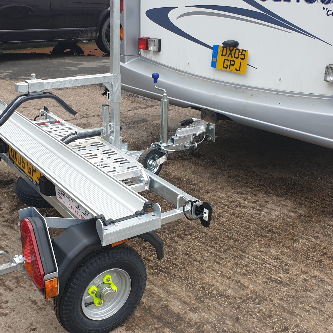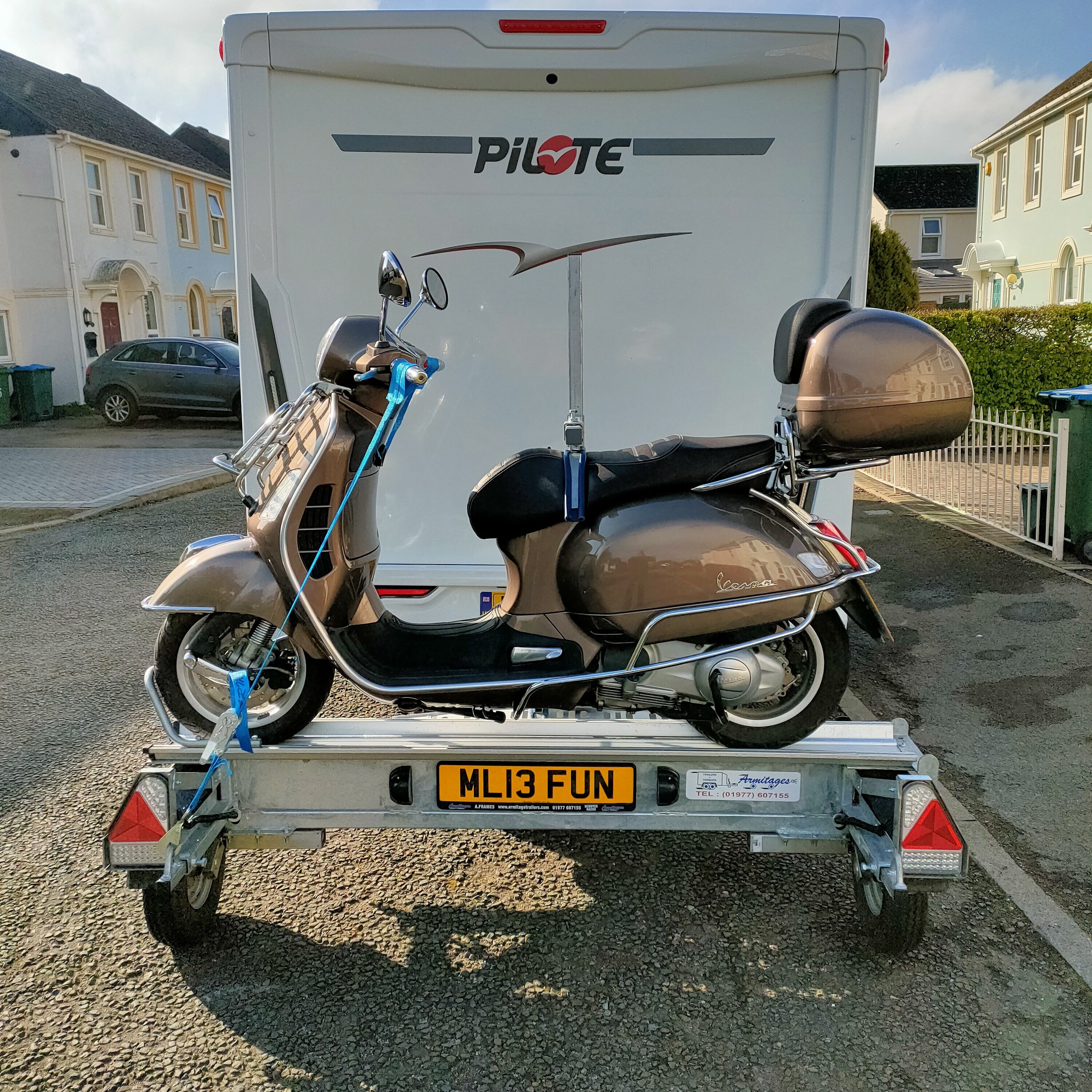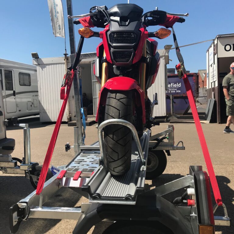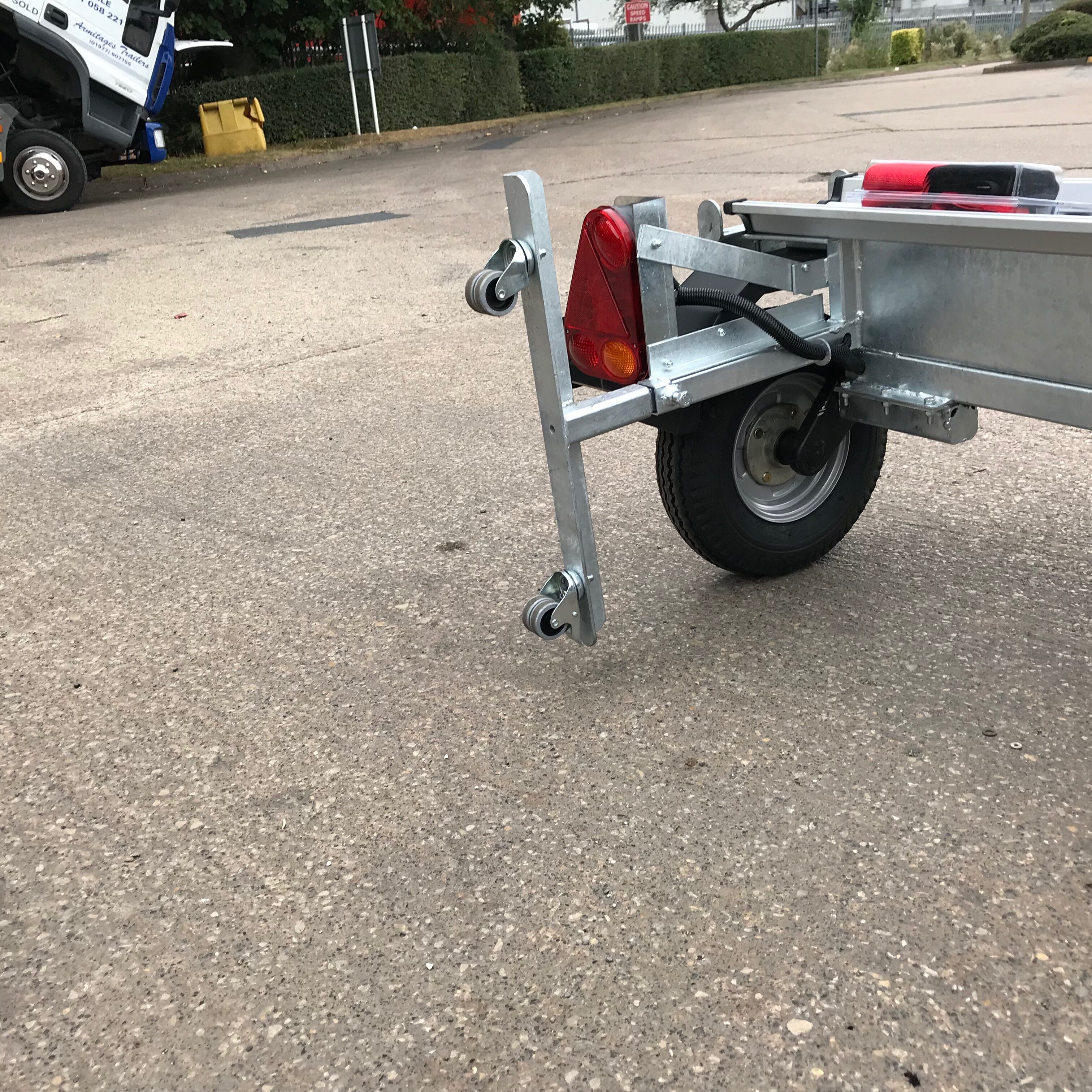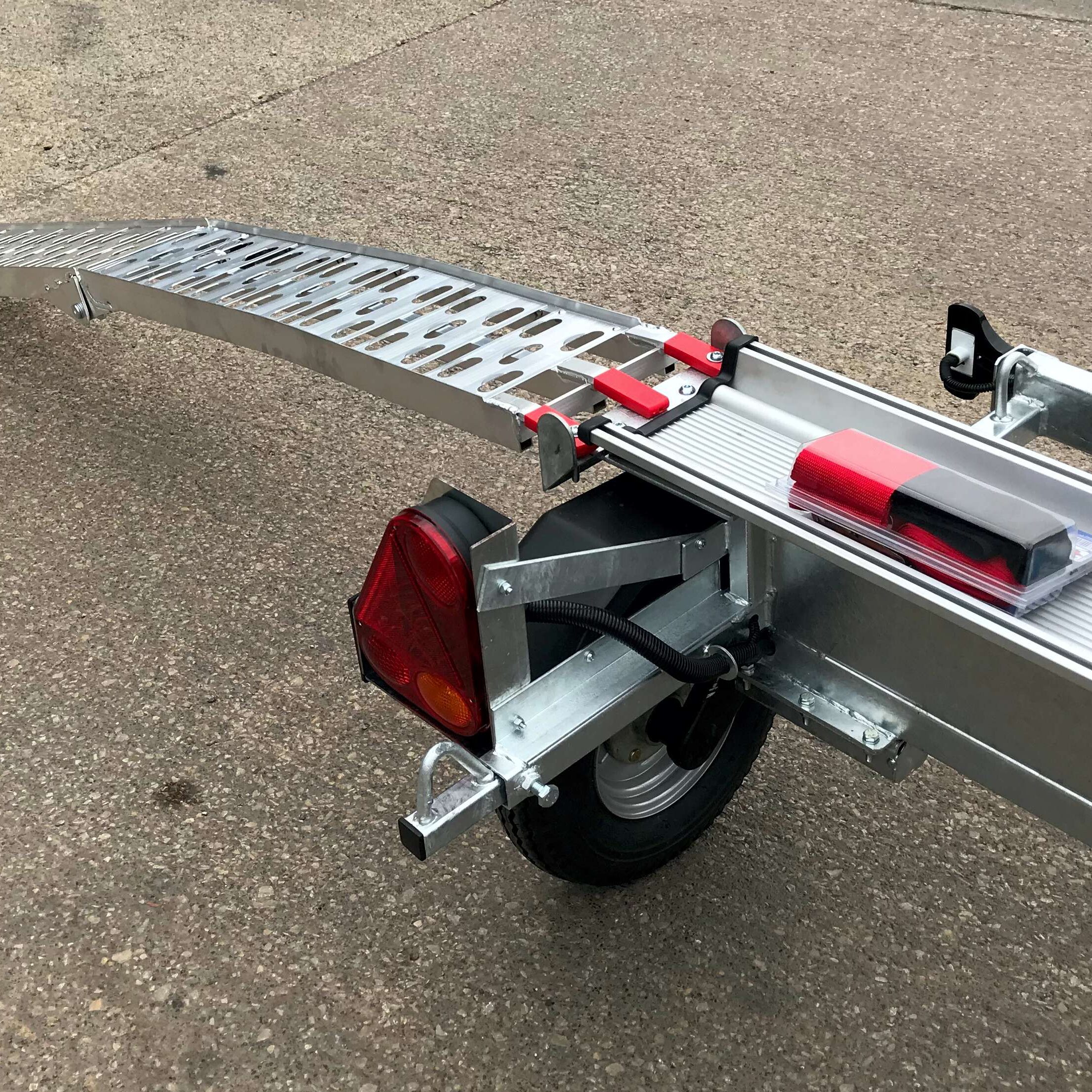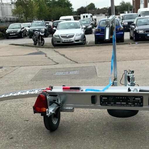 Here we have our very popular sleek premium built side loading Scooter / Motorbike trailer with space saving in mind and infinitely adjustable for any type of bike. This can save you valuable money with some Ferry companies on your train length, when on site you can leave it locked to your towbar without it taking too much space behind you (no longer than a RV) they are also very conveniently stored on end when not in use. This is a premium built trailer with a fully welded construction then hot dipped galvanised for longevity. The quality of our trailers is not like any other in its type right down to the smaller details of running all the wires through the main body of the trailer leaving minimal exposed wires and not just tie wrapped to the chassis. We feel that with a premium built trailer you shouldn’t have to buy bolt on extra’s such as tie downs to secure your precious load and security couplings to keep it safe when you’re out and about, so with this in mind all our transverse trailers come with a handle bar securing ratchet strap set, seat clamping system with special designed ratchet strap to compress the suspension more than the human body could compress, Bradley cast coupling with a high security barrel lock, very long folding lightweight aluminium loading ramp for a nice steady incline and legs to stand it on end. However, we do have 3 optional extra’s a mounted spare wheel (some customers have one off their garden trailer), the braked castor wheel system for wheeling through gate ways and tight places (not required by all) and all LED light upgrade.