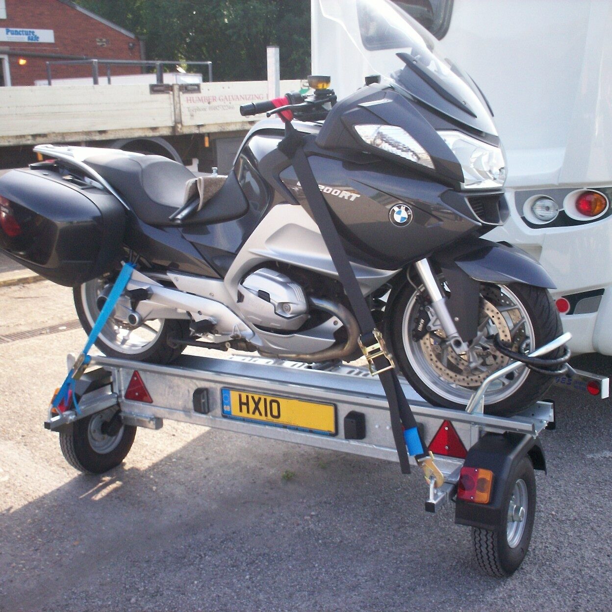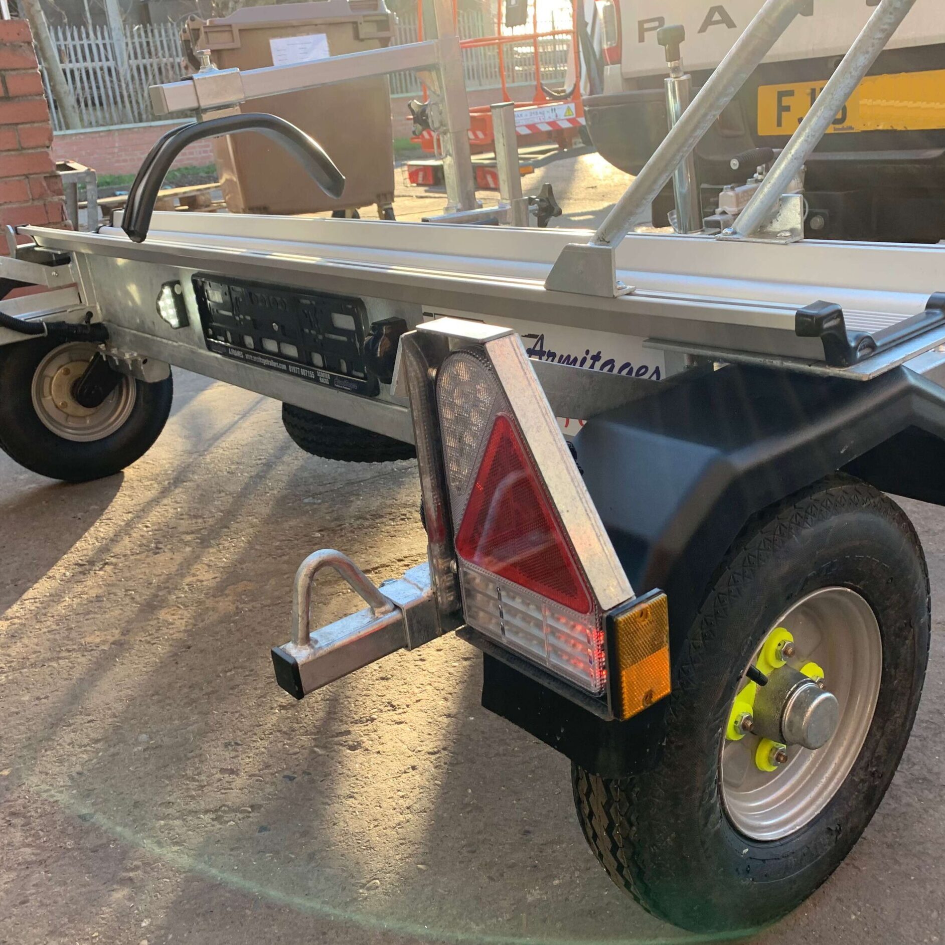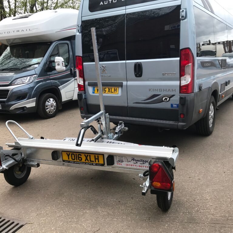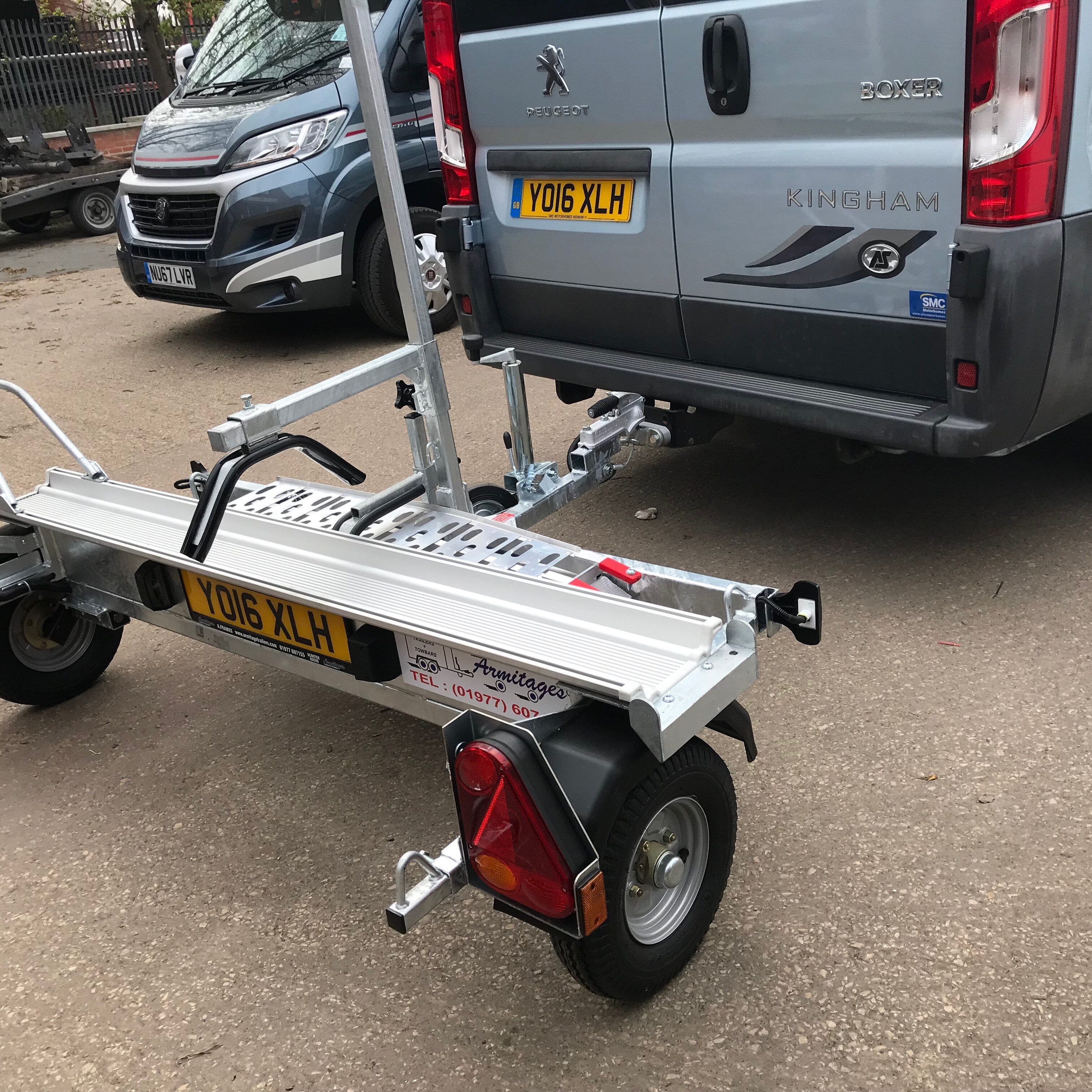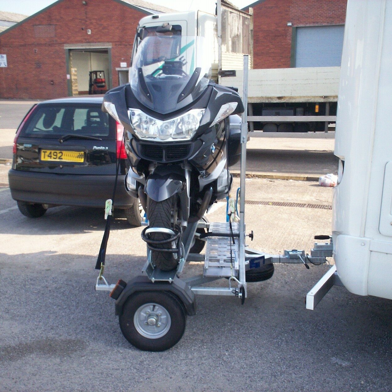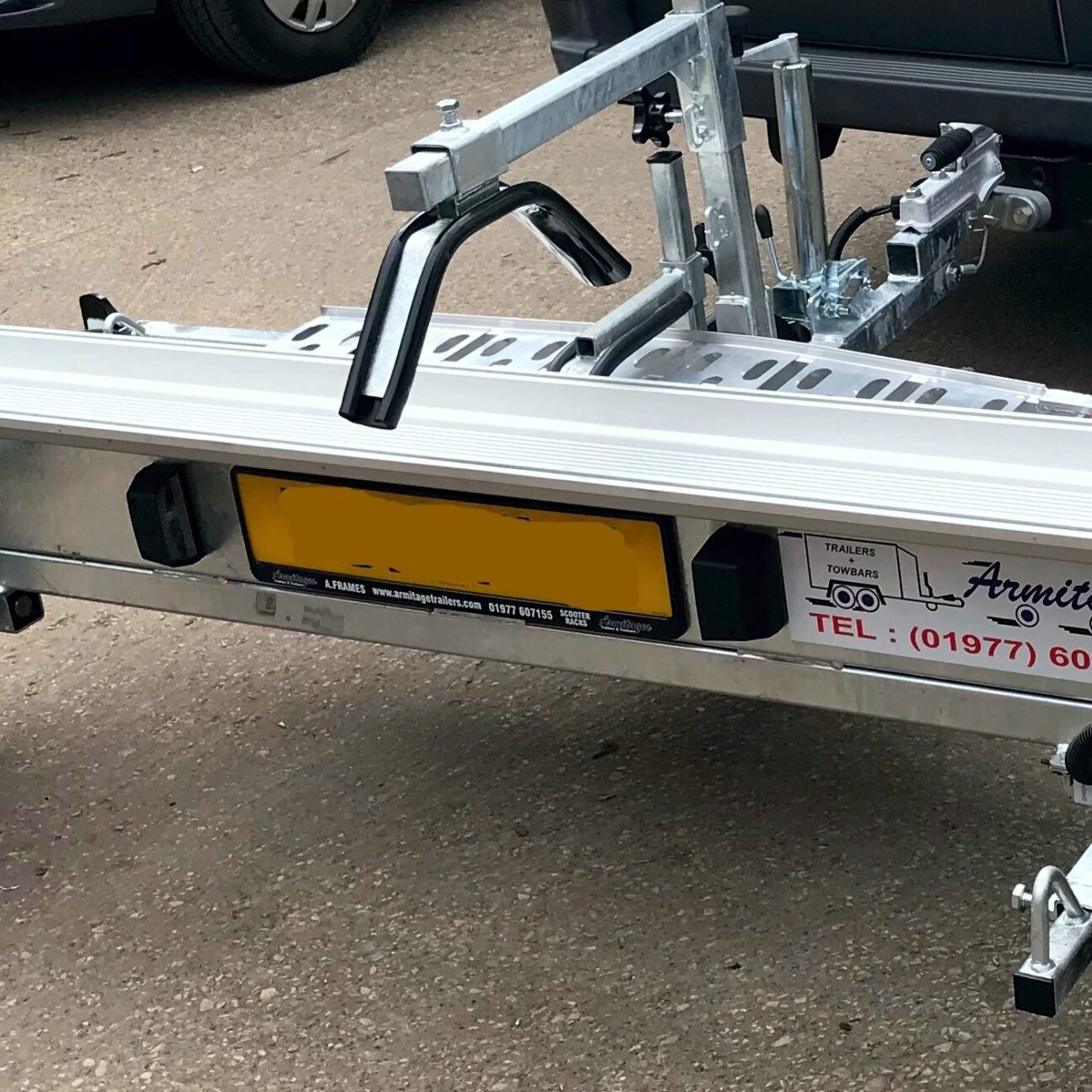 Here we have our very popular sleek premium built side loading Scooter / Motorbike trailer with space saving in mind and infinitely adjustable for any type of bike. This can save you valuable money with some Ferry companies on your train length, when on site you can leave it locked to your towbar without it taking too much space behind you (no longer than a RV) they are also very conveniently stored on end when not in use. This is a premium built trailer with a fully welded construction then hot dipped galvanised for longevity. The quality of our trailers is not like any other in its type right down to the smaller details of running all the wires through the main body of the trailer leaving minimal exposed wires and not just tie wrapped to the chassis. We feel that with a premium built trailer you shouldn’t have to buy bolt on extra’s such as tie downs to secure your precious load and security couplings to keep it safe when you’re out and about, so with this in mind all our transverse trailers come with a handle bar securing ratchet strap set, seat clamping system with special designed ratchet strap to compress the suspension more than the human body could compress, Bradley cast coupling with a high security barrel lock, very long folding lightweight aluminium loading ramp for a nice steady incline and legs to stand it on end. However, we do have 3 optional extra’s a mounted spare wheel (some customers have one off their garden trailer), the braked castor wheel system for wheeling through gate ways and tight places (not required by all) and all LED light upgrade.