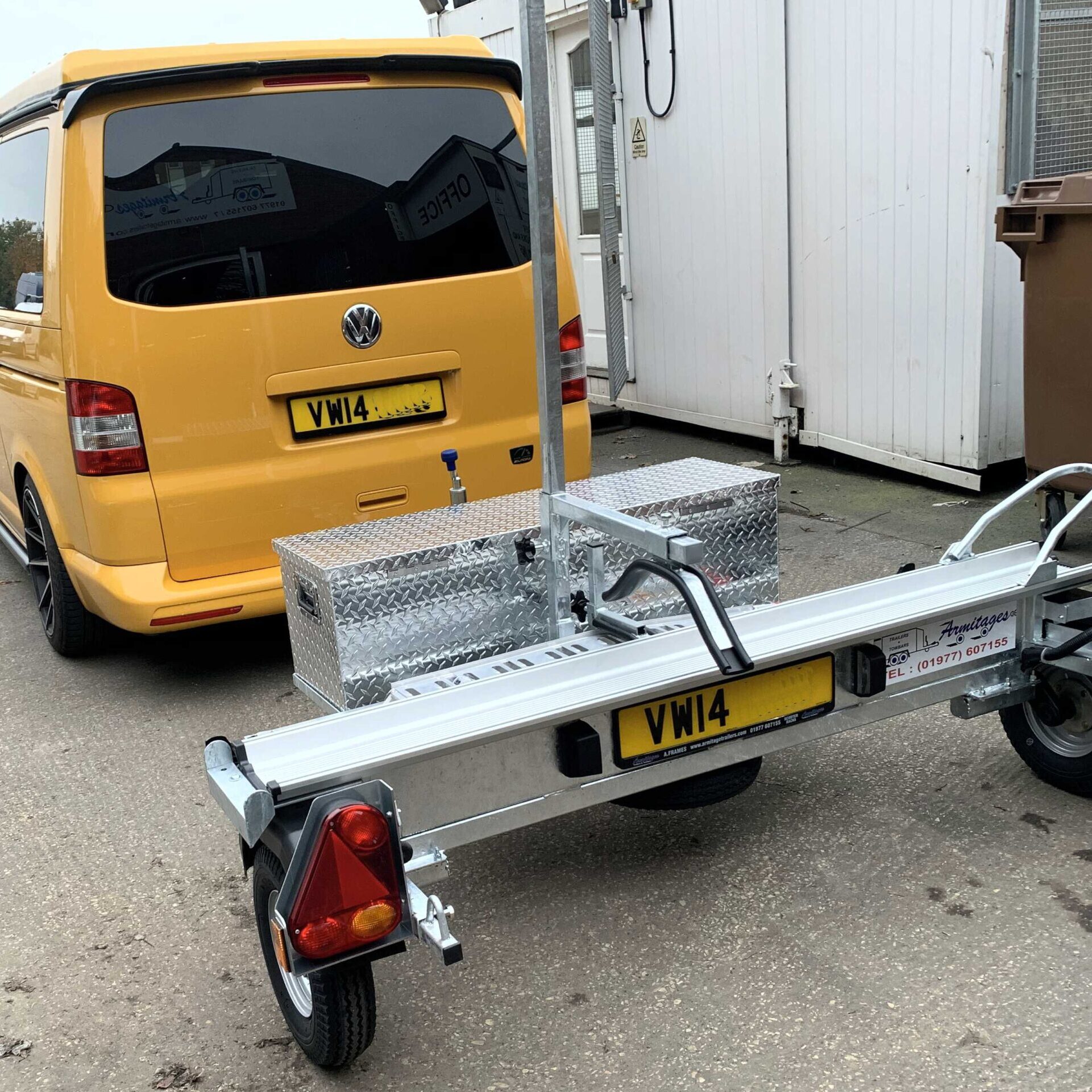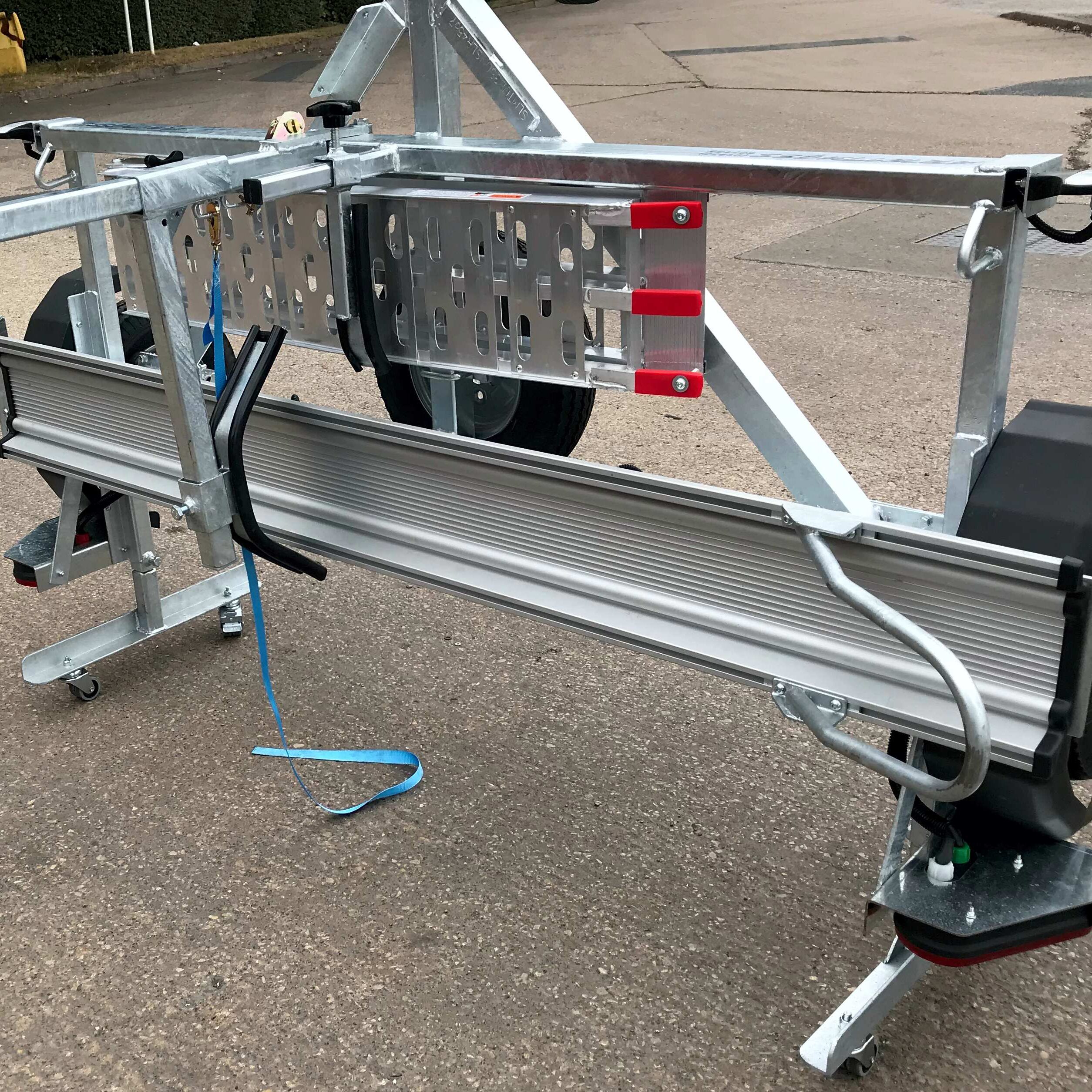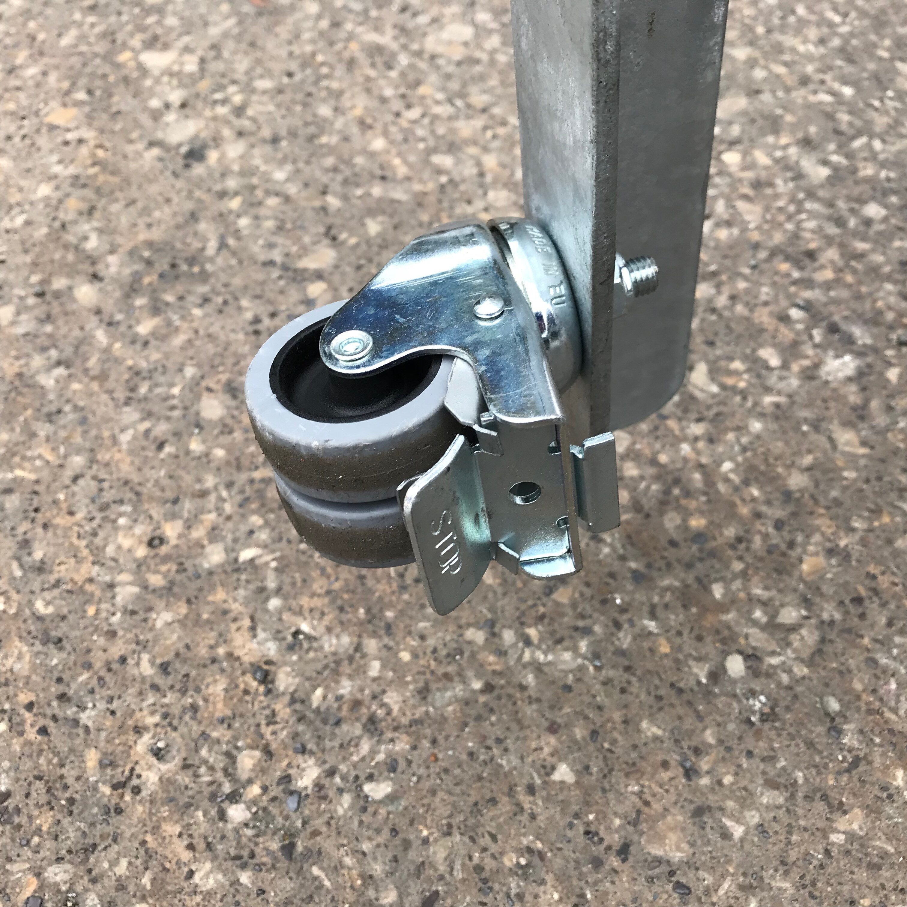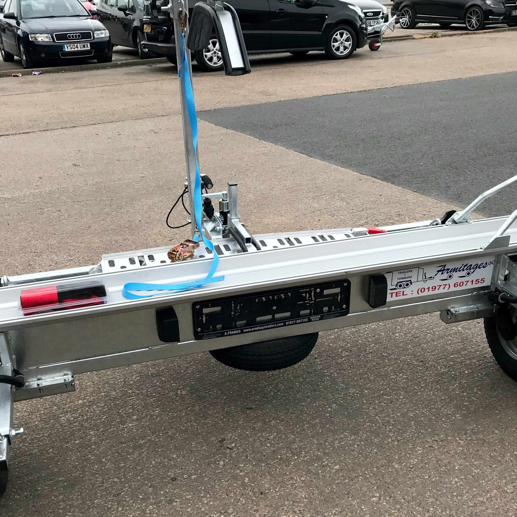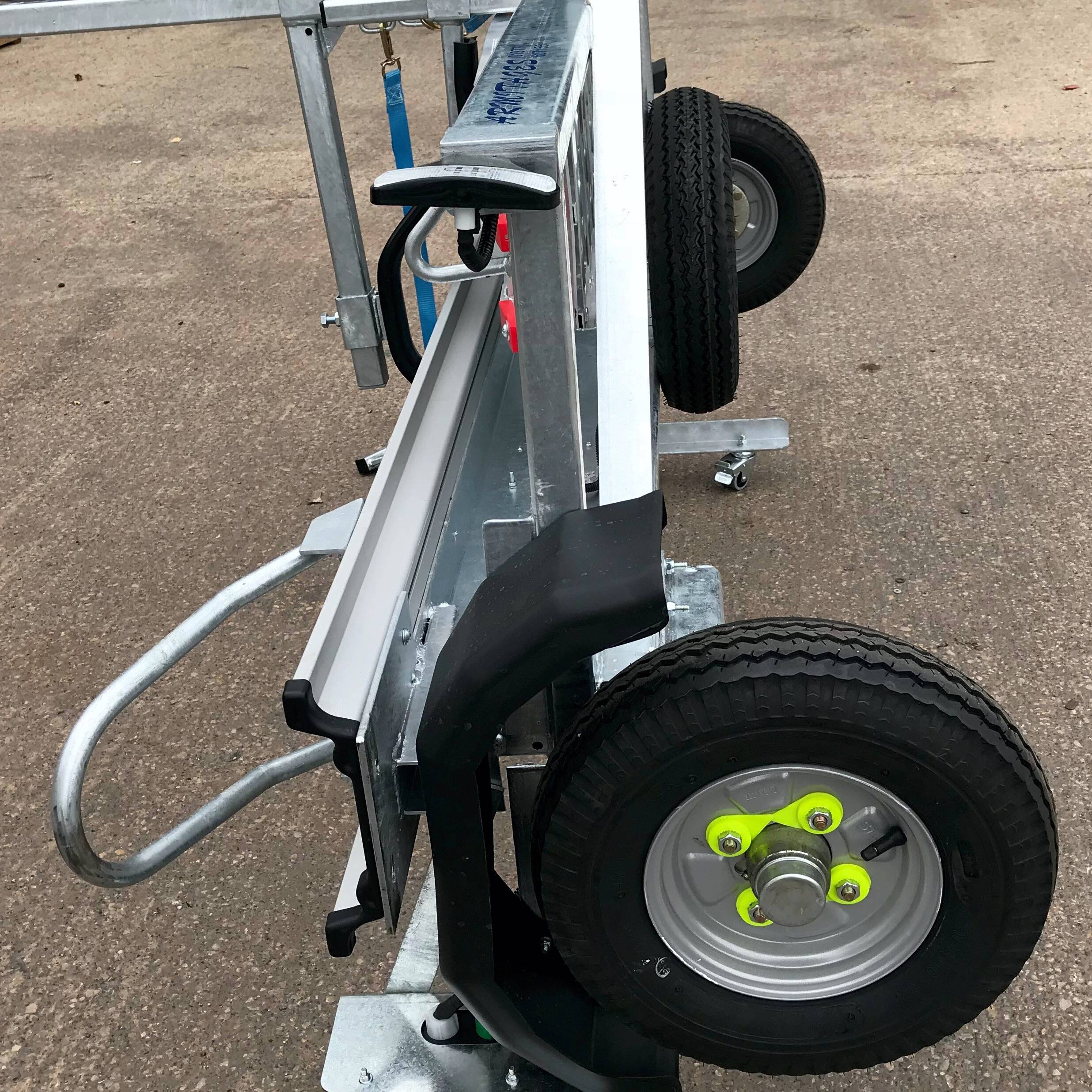 All our Transverse trailer range will stand on end against a wall with no alterations via the rear tie down stub legs but they will also stand on end at a slight angle in the middle of the garage with no wall assistance by removing the rear tie down stub legs which will leave a much shorter leg and the lights are protected. The seat clamp post is easily removed via 1 x M12 bolt, give it a wiggle to open the jaws that clamp it to the steel cross bearer and off it pops. Better still we have a braked castor storage solution which is great for those who need to get the Motorbike / Scooter trailer through a small gate way to the back of the house or simply to manoeuvre the trailer around in to a more convenient area whilst in the upright position. You simply slot in the castor system to where the rear tie down leg would have been with the braked castor closest to the ground, apply the brake so when you lift it doesn’t run away with you, when it’s in the upright position you simply disengage the brake to manoeuvre it around in any 360 degree direction that you choose.